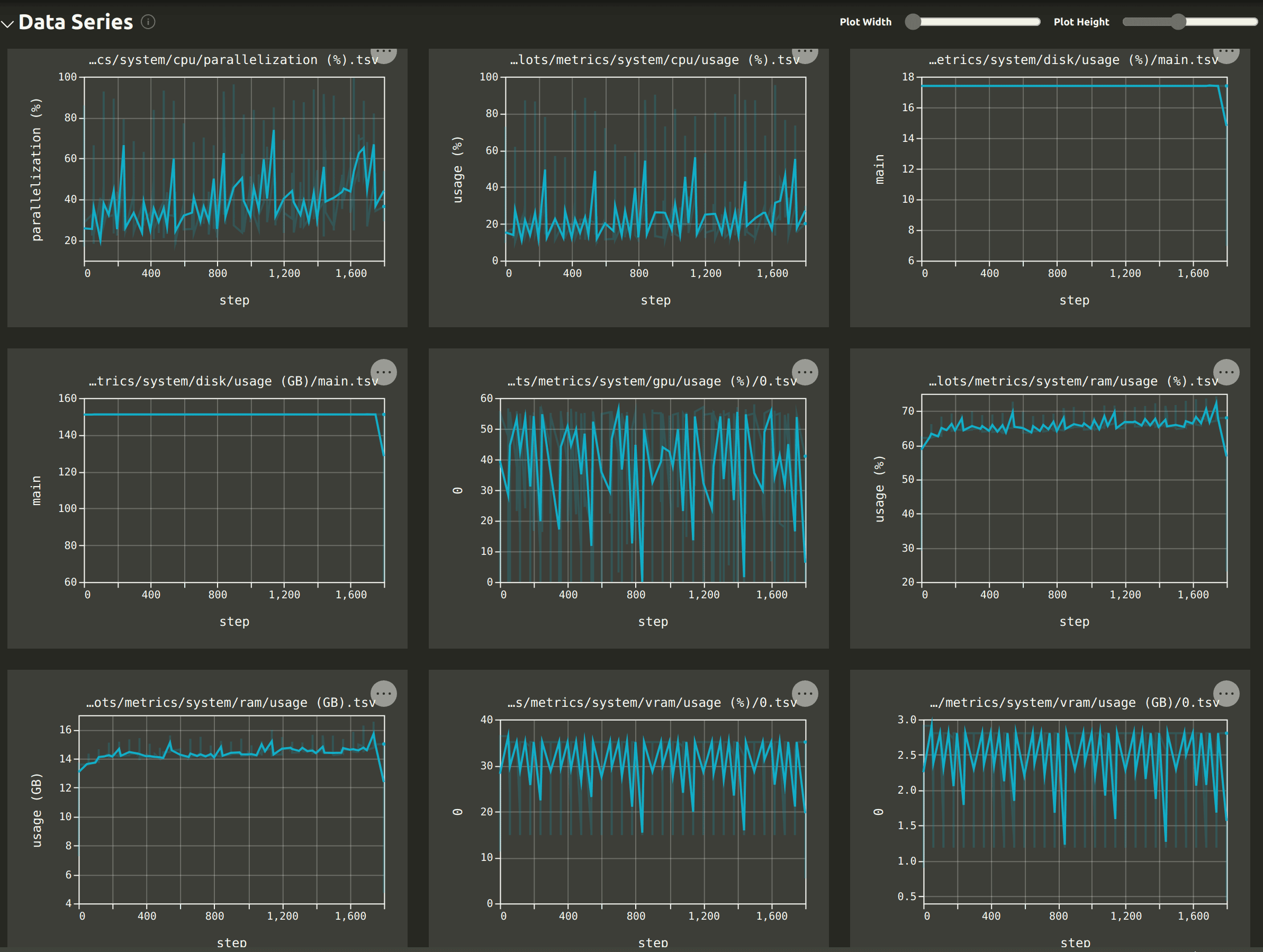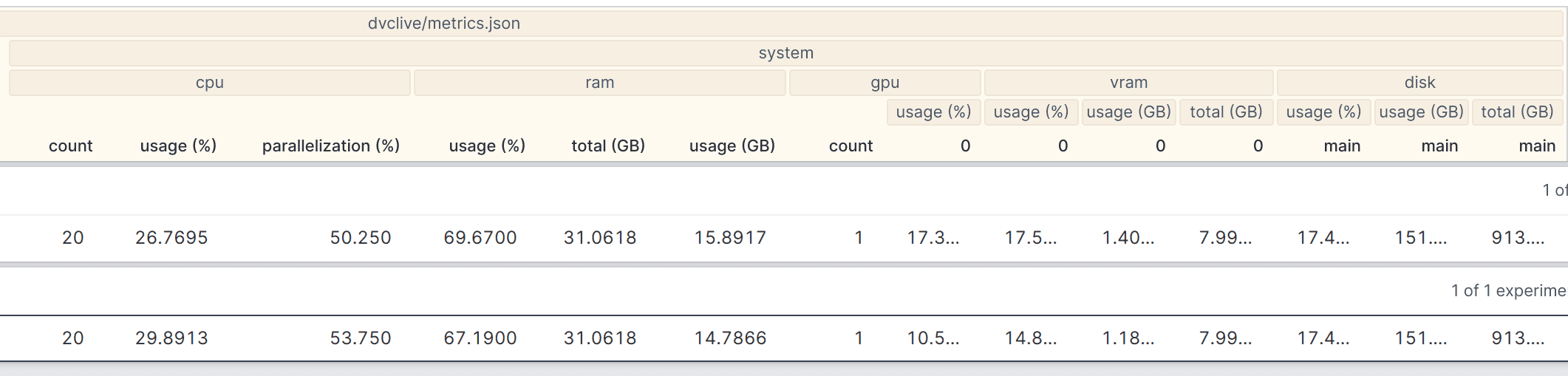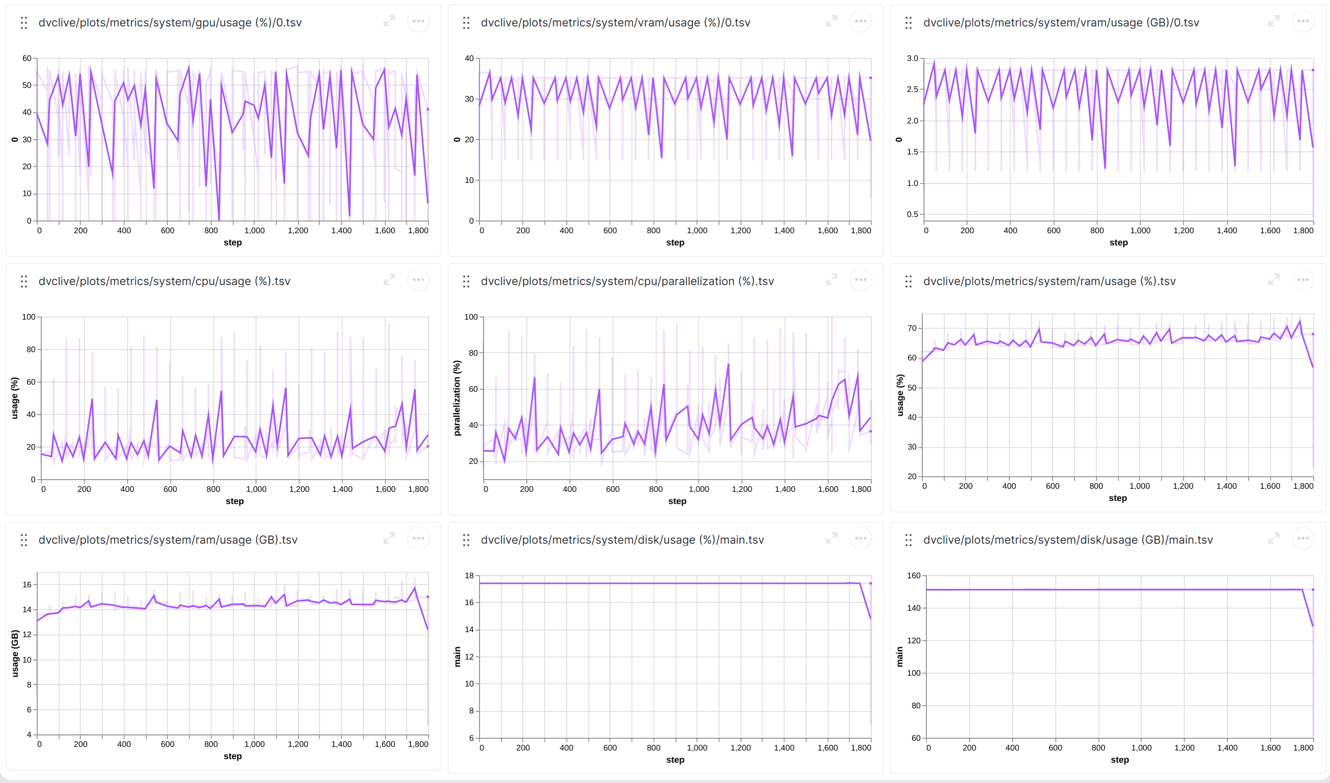 DVCLive 可以跟踪并记录您的系统指标,以便在实验过程中查看硬件性能与限制。这些指标涵盖 CPU、RAM 和磁盘内存使用情况。如果您配备了 GPU,它还可以监控 GPU 使用情况。