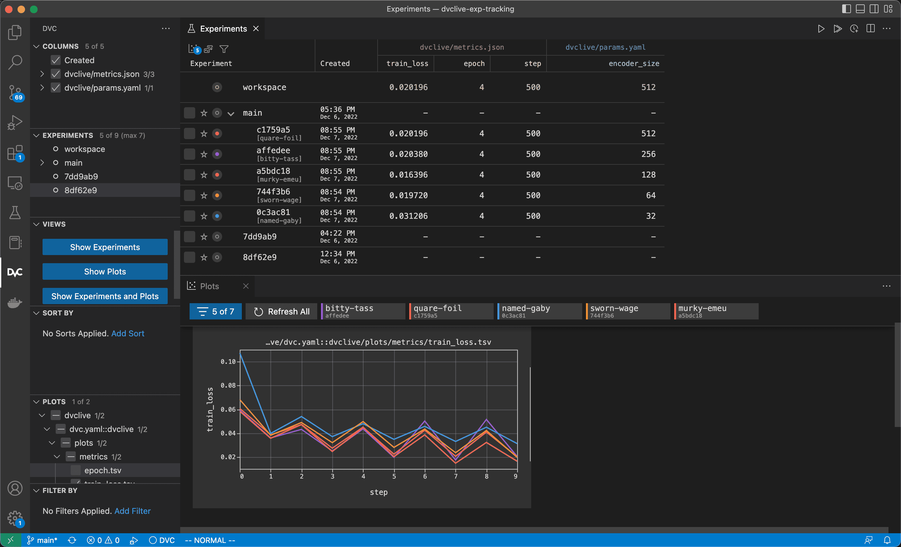 $ dvc plots diff $(dvc exp list --name-only)