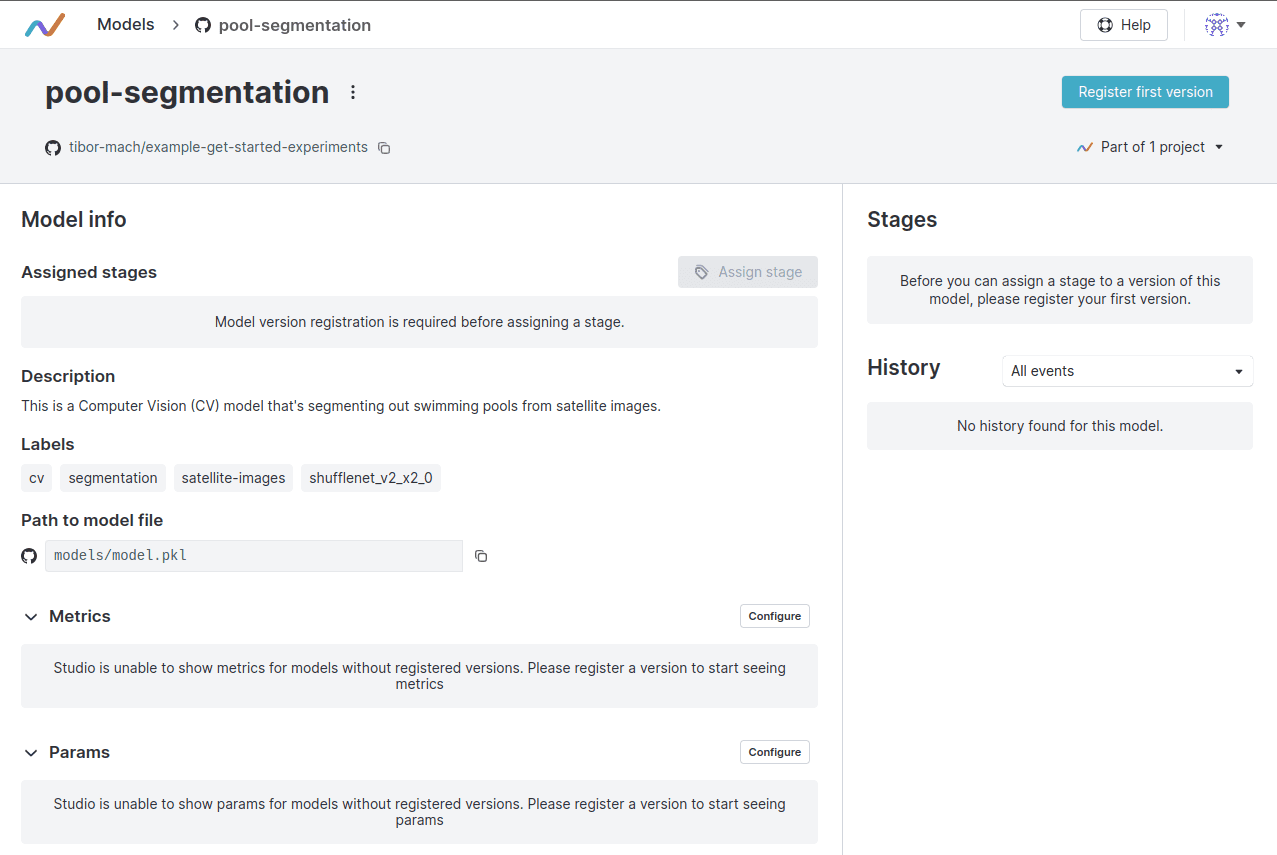 现在我们已经添加了一个模型,如果你进入 DVC Studio 的“模型”标签页并选择 pool-segmentation
