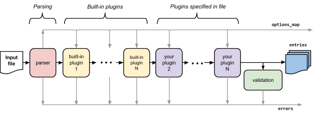 处理插件。 对每个插件,加载插件模块,并使用前一阶段的 entries 列表和 options_map 调用其函数,用插件返回的新列表替换当前列表。这使得插件能够过滤条目。