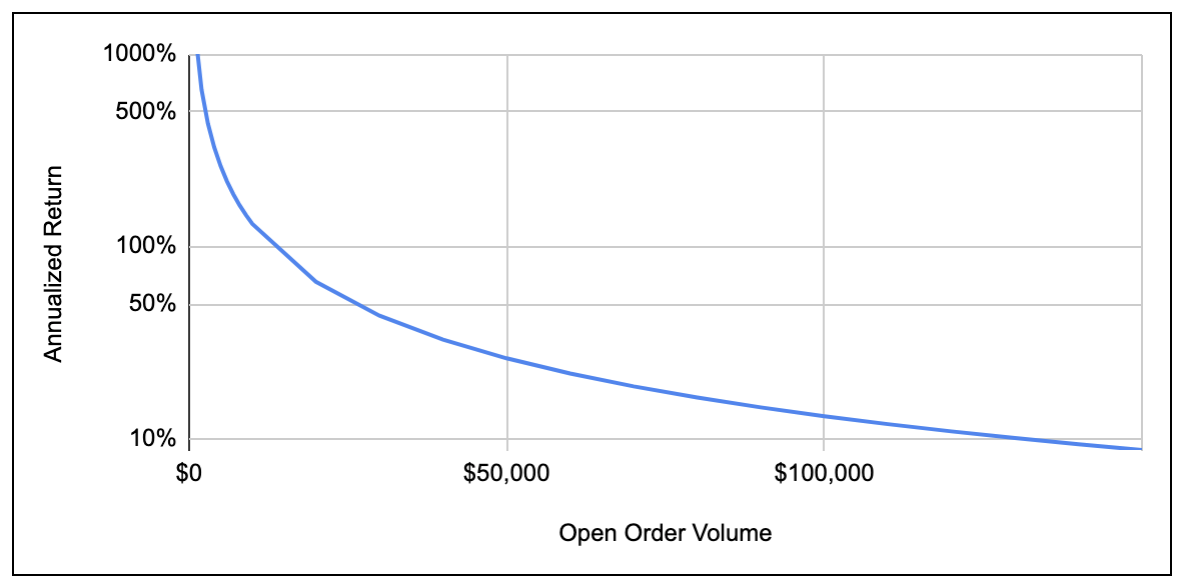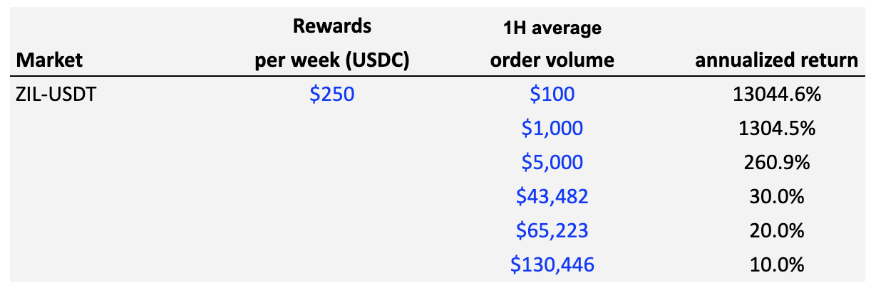 年化收益率是衡量矿工可获得奖励的一个指标,表示为符合条件的未成交订单总额的年化百分比。下表展示了基于不同参与水平(或未成交订单量)下 ZIL-USDT 交易对的收益示例: