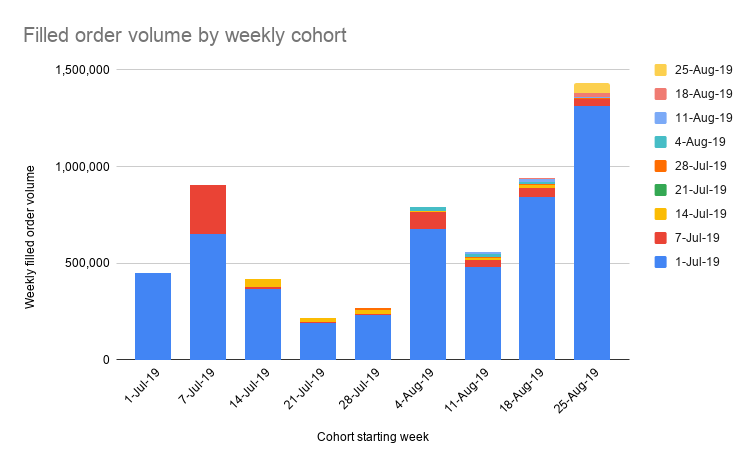 绝大多数交易量来自最初的那一周用户群体,而且该群体的成交订单量随着时间显著增加。