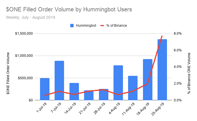 在 $ONE 价格下跌 60% 的两个月期间,参与 $ONE Makers 的 Hummingbot 用户大幅增加了他们提供的流动性。仅有 43 名活跃参与者的情况下,Hummingbot 用户在八月最后一周产生了 140 万美元的成交订单量,几乎占 Binance 上 $ONE 总交易量的 8%。