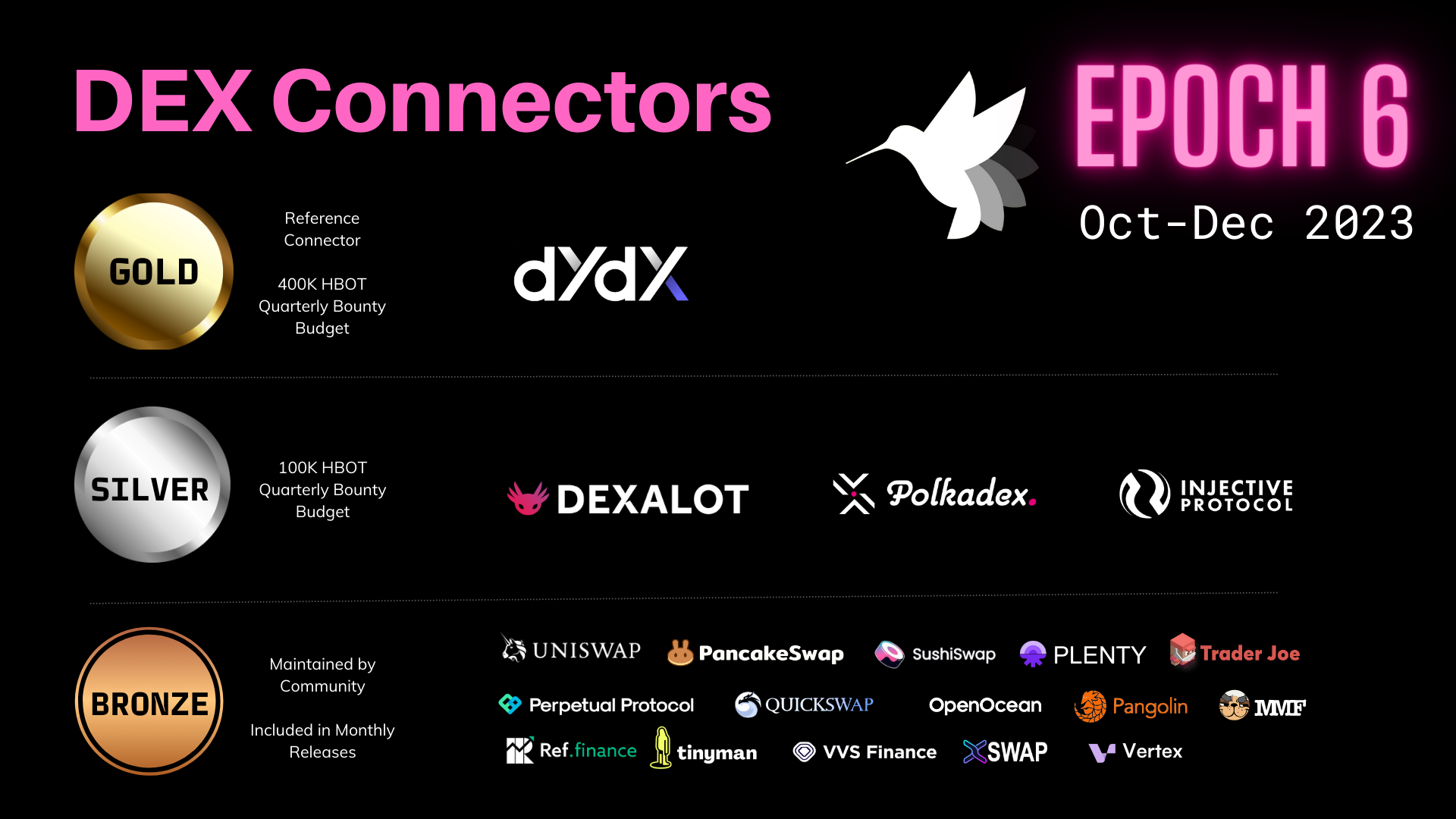 得票数排名第 2、第 3 和第 4 的 DEX 连接器将各自获得 10 万 HBOT 的赏金预算,我们将使用这笔资金支持漏洞、改进和内容相关的赏金任务,以便社区在未来一个季度内协助维护和升级这些连接器。
