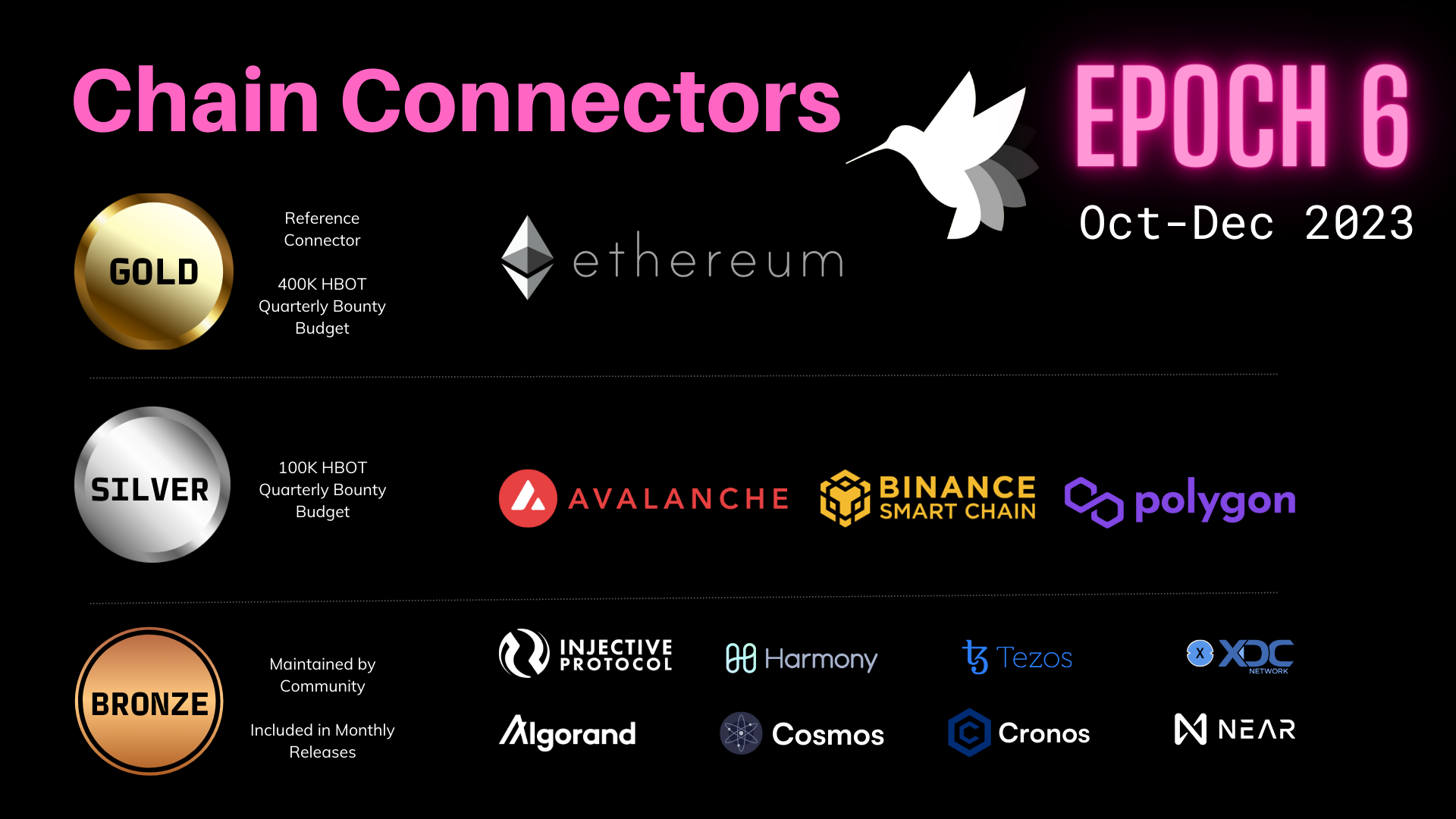 得票数排名第 2、第 3 和第 4 的链连接器将各自获得 10 万 HBOT 的赏金预算,我们将使用这笔资金支持漏洞、改进和内容相关的赏金任务,以便社区在未来一个季度内协助维护和升级这些连接器。