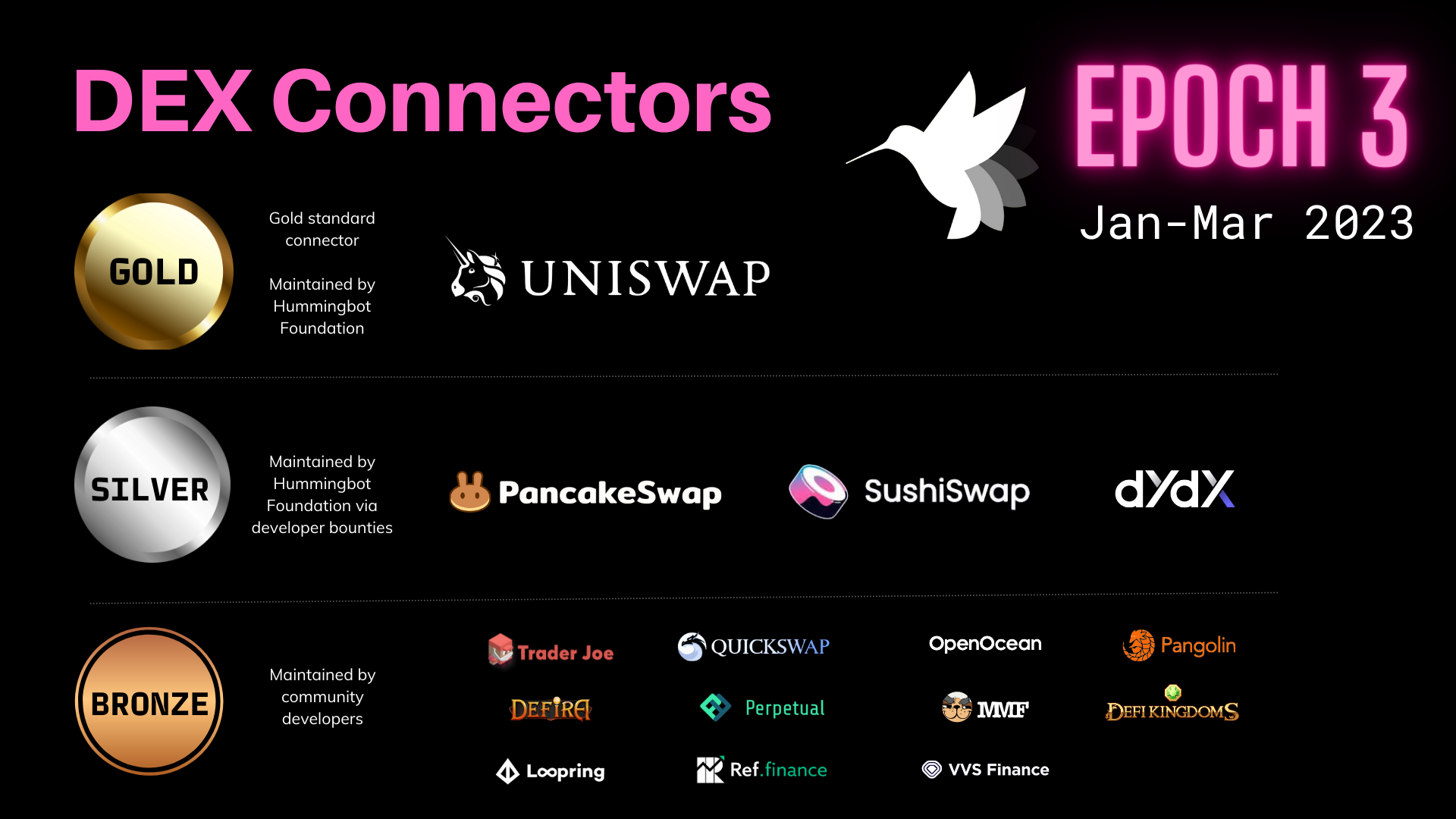 - 白银级(Silver):排名第二至第四的交易所为 白银级 交易所。基金会也将成为这些交易所现货和永续合约连接器的官方维护者,但其连接器的维护将通过社区开发者赏金计划完成,并参照黄金级交易所连接器的改进进行同步更新。