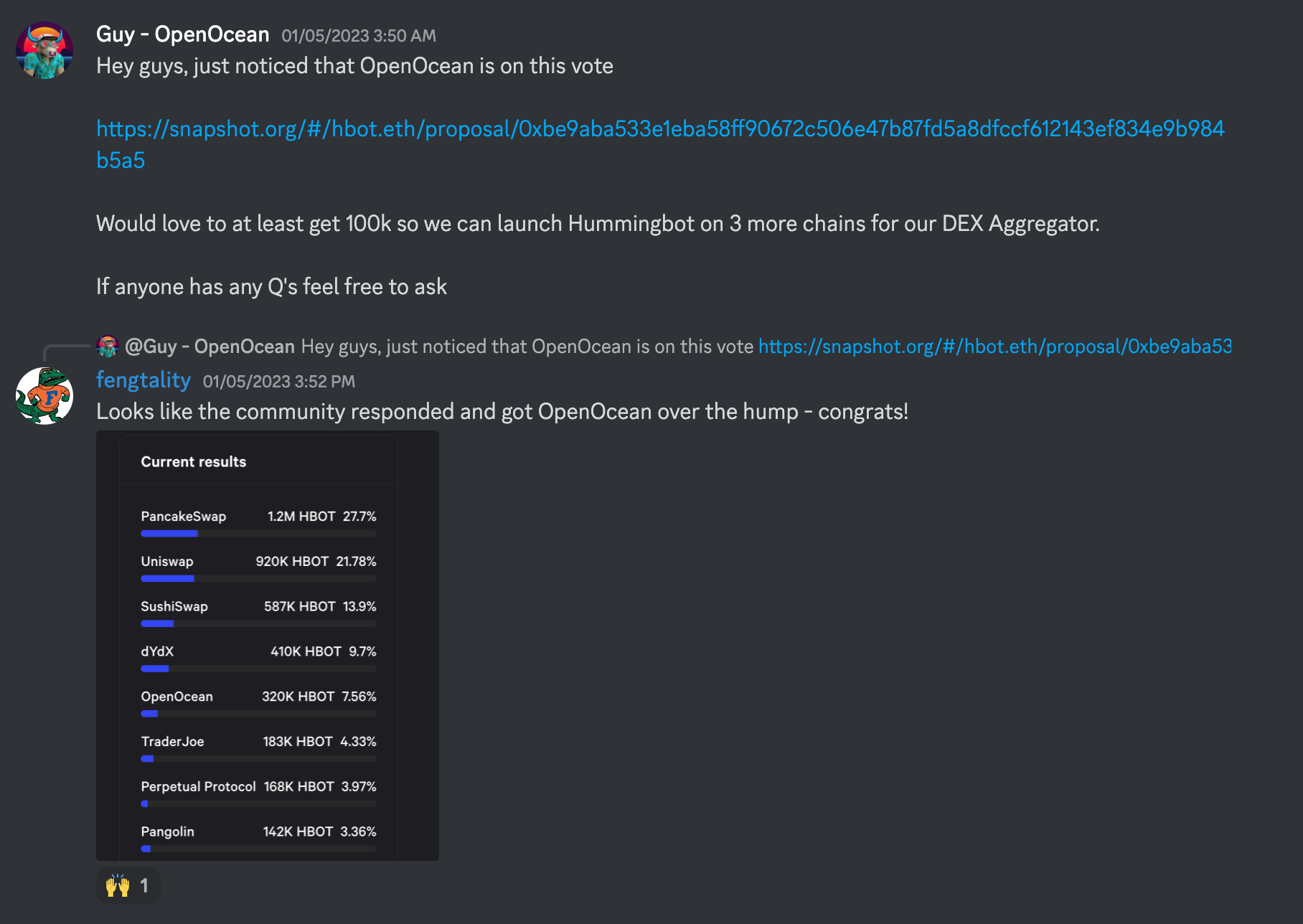 - 在 Discord 上为你的交易所开展宣传:加入我们的 Discord,发布信息并与社区互动,社区成员可在其中发表评论并讨论投票议题。例如,在第一轮周期投票中,OpenOcean 就是成功执行此策略的交易所之一。