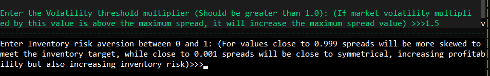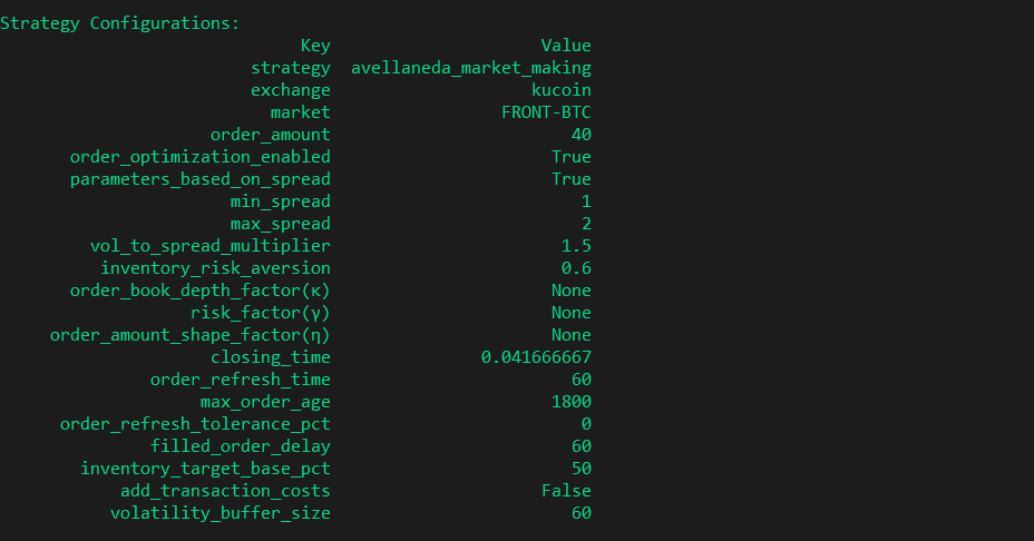 - 风险因子 (γ) 和订单簿深度 (κ): 尽管原始论文未明确给出这些参数的具体计算方法,但 Hummingbot 的“简易模式”会根据设定的理想价差范围自动确定它们。或者,可将 config parameters_based_on_spread设置为False,然后使用config order_book_depth_factor和config risk_factor手动输入数值。