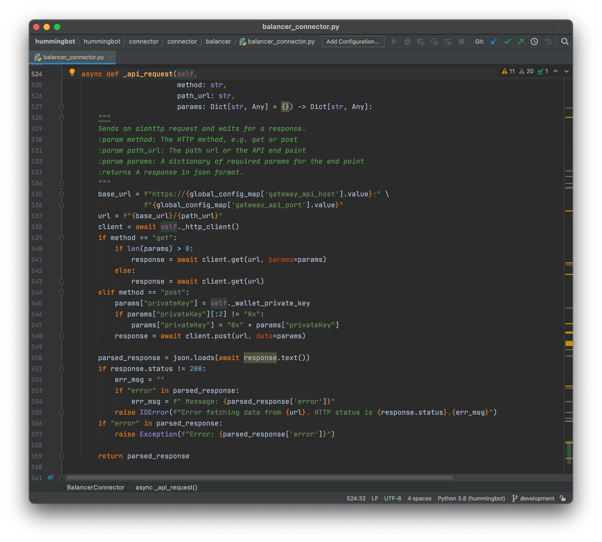 以 Balancer DEX 连接器为例。连接器中的几乎所有操作——无论是获取订单价格等市场数据、查询钱包余额还是下单——都会通过BalancerConnector._api_request()方法执行。当你查看该方法时,会发现它实际上只是将所有工作委托给一个网关 API 端点。