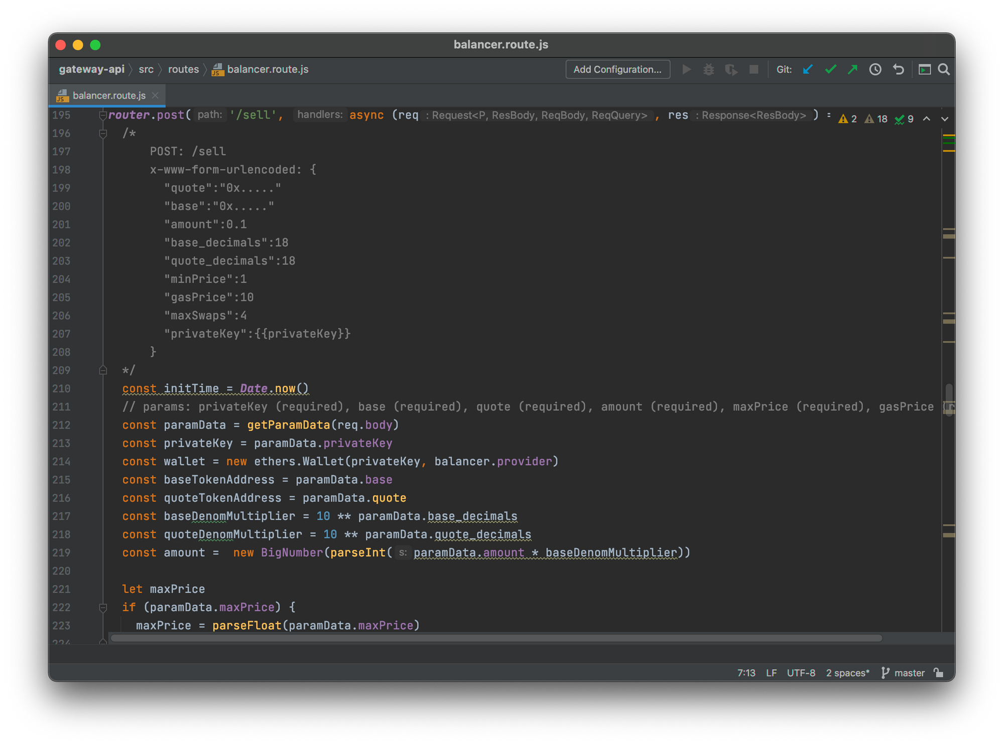 网关 API 的源代码可以在我们的 gateway-api 仓库中找到(https://github.com/hummingbot/gateway)。例如,以下是网关 API 侧如何实现 balancer/sell API 端点的示例。