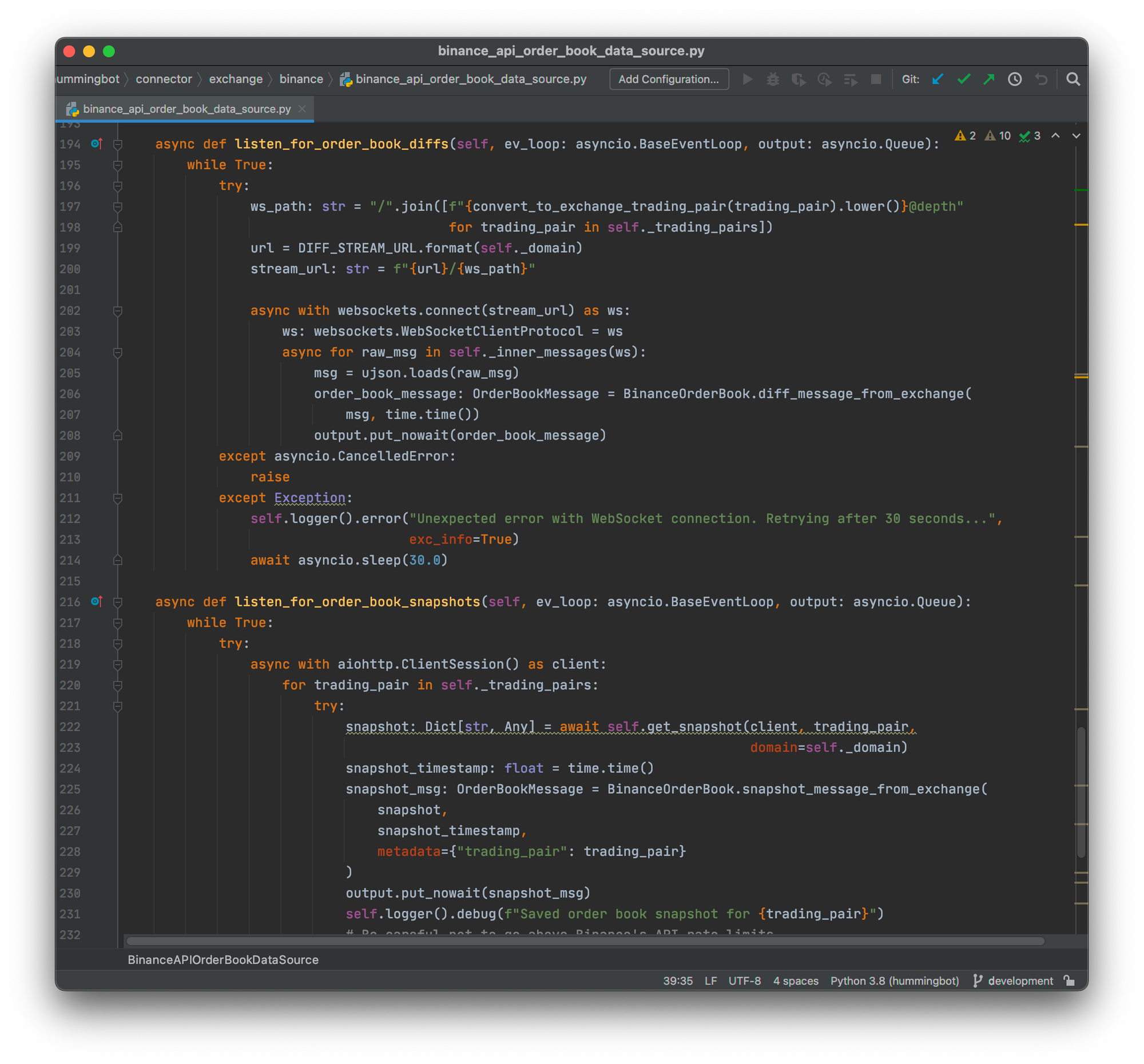 Hummingbot 的市场连接器被设计为优先使用可用的最低延迟数据源,对于大多数中心化交易所而言,这一数据源就是 WebSocket。让我们再次以 Binance 市场连接器为例,具体来看位于 hummingbot.connector.exchange.binance.binance_api_order_book_data_source 模块中的 BinanceAPIOrderBookDataSource。