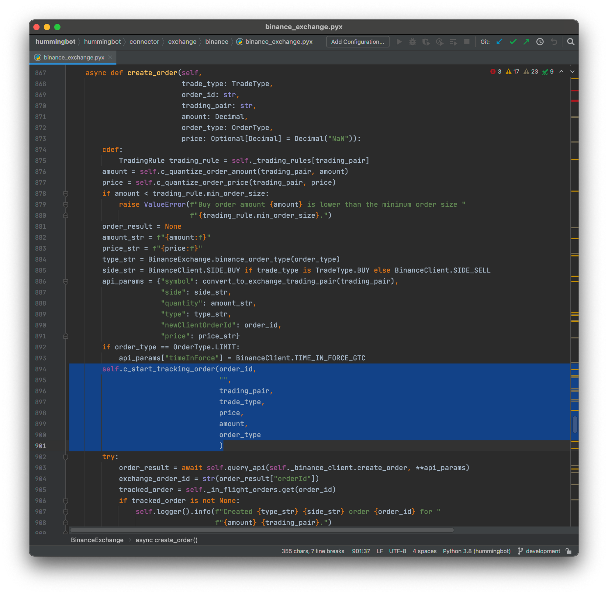 由于当时无法保证交易所 API 会对订单创建请求做出响应,因此我们无法确切知道订单是否已被成功提交到市场。如果你查看 BinanceExchange.create_order() 函数,会发现该交易所连接器会在向交易所 API 提交订单之前就开始跟踪该订单。