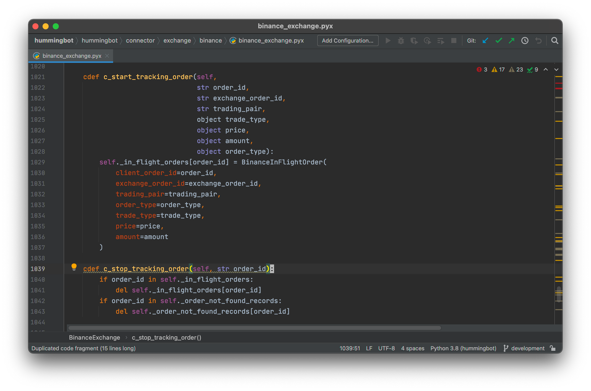 例如,在 Binance 交易所连接器中,你可以在 BinanceExchange.c_start_tracking_order() 和 BinanceExchange.c_stop_tracking_order() 中找到订单跟踪逻辑。这些函数通常在创建订单、取消订单以及从交易所 API 收到订单状态更新时被调用。