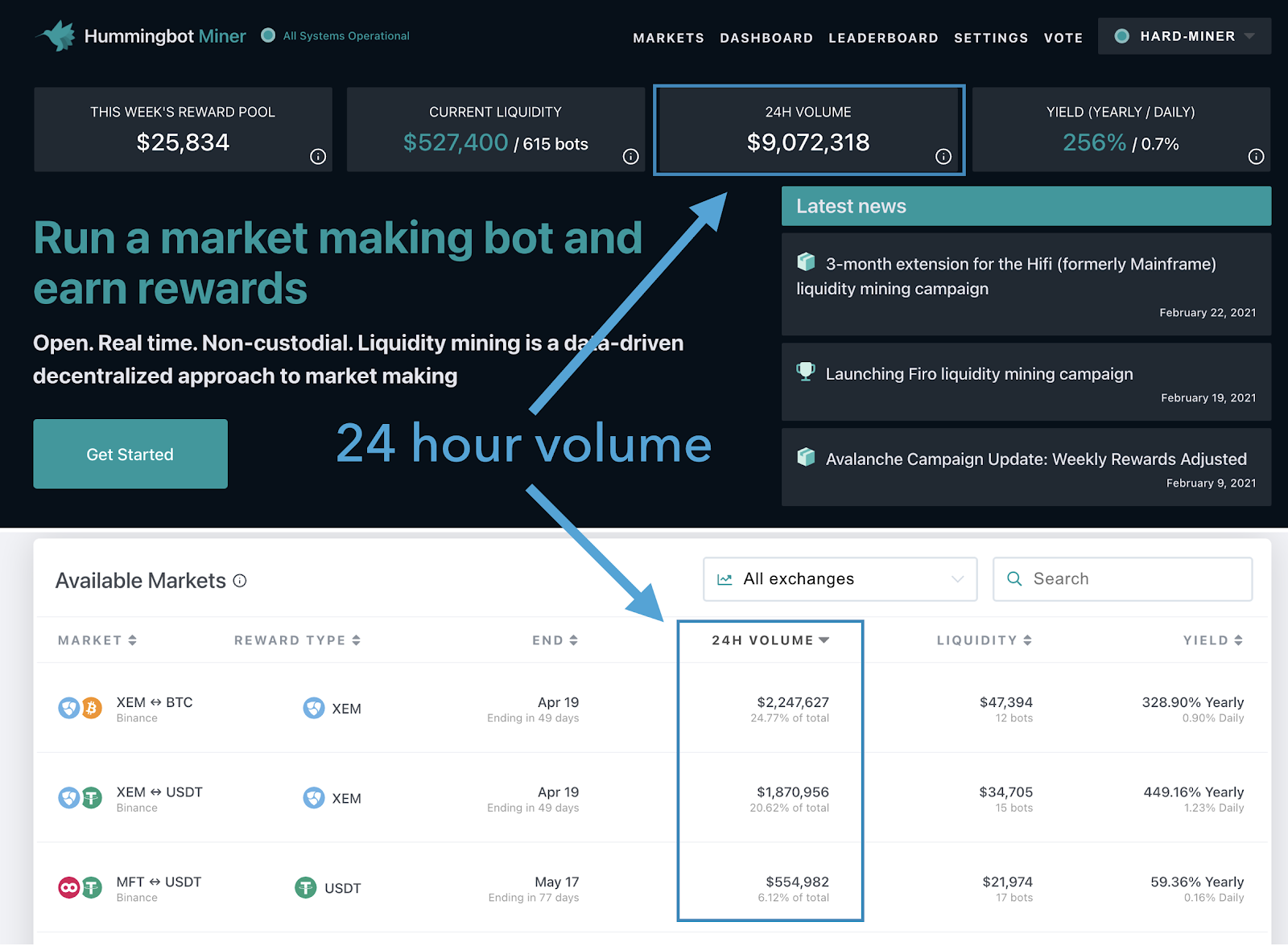 应用程序现在会显示我们矿工在过去 24 小时内产生的交易量。该指标展示了我们的 Hummingbot 矿工挂单(订单簿深度)中已被成交的部分。这代表了有多少交易受益于 Hummingbot 矿工提供的订单簿深度。
