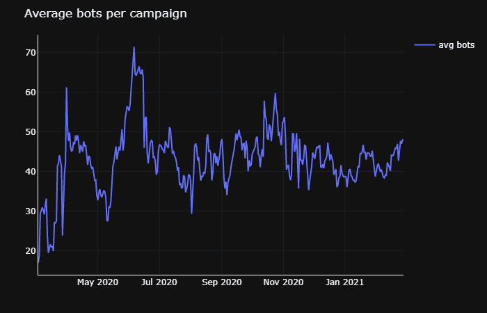 平均而言,每个发行方活动均有 40 至 50 个活跃机器人参与: