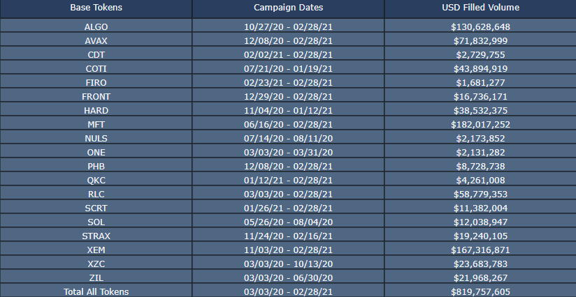 我们很高兴在过去的一年中,该平台为 18 个不同的代币发行方提供了流动性,共有 1,622 名独立矿工参与并获得奖励。我们的去中心化做市社区创造了订单簿深度和流动性,使得各类流动性挖矿活动的总交易额达到了 8.37 亿美元!