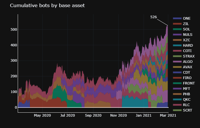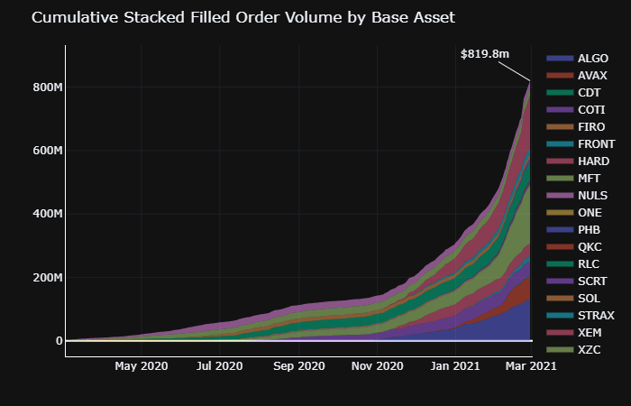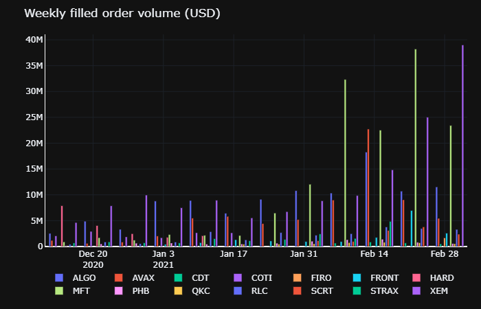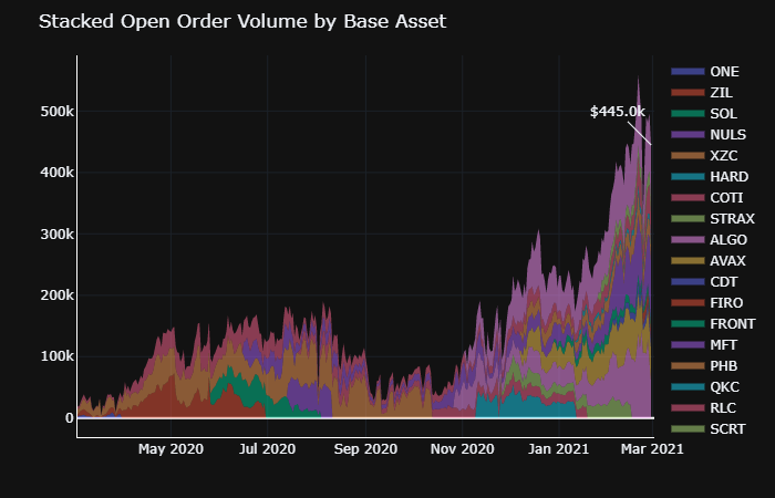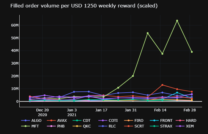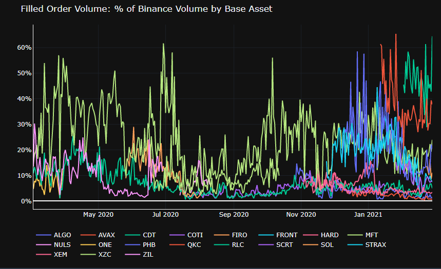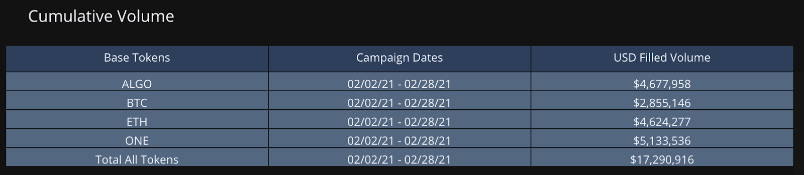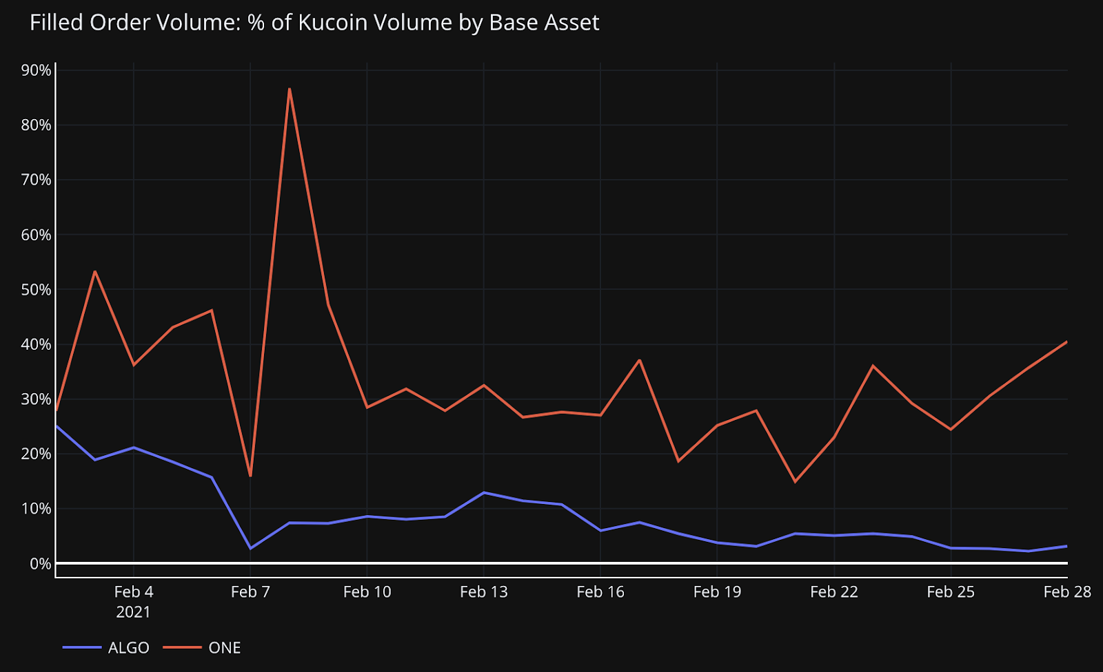 在整个 2 月份,Hummingbot 矿工为 Harmony ONE 和 Algo 贡献了相当可观的交易量,最高分别达到 87%和 25%: