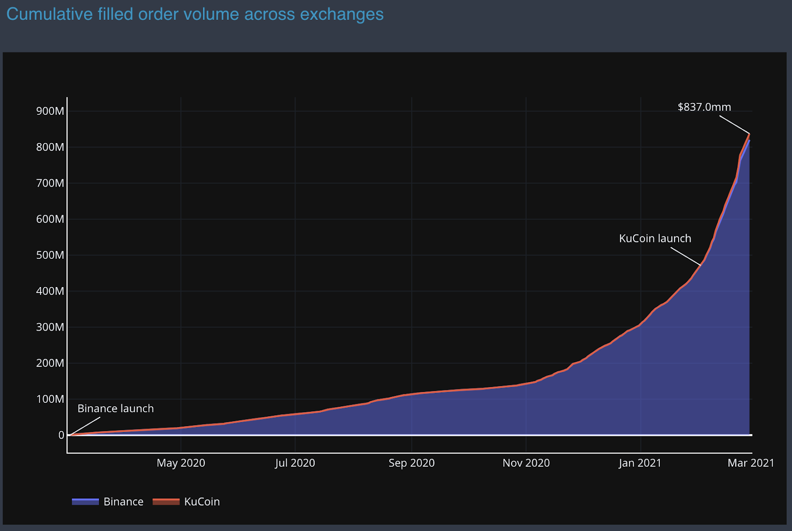 我们在 2 月初于第二家交易所 KuCoin 上线了流动性挖矿。这是我们公司发展的一个重要里程碑,因为我们一直致力于使流动性挖矿系统更加稳定和可扩展,以便拓展到更多交易所。我们计划今年至少再支持 4 家新交易所,而这仅仅是个开始!