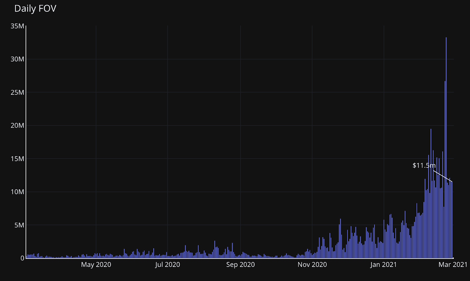 我们还添加了另一项指标,展示矿工的每日交易量。最近几周,Hummingbot 矿工的交易量大幅增长,日均交易额达 1000 万至 1500 万美元,在 2 月 23 日达到峰值 3330 万美元: