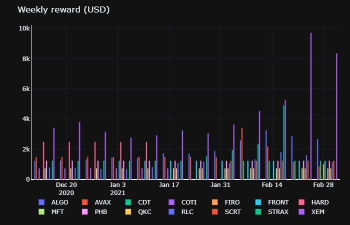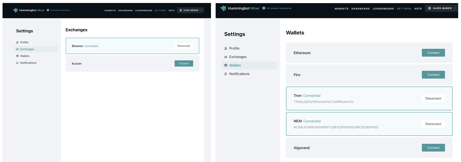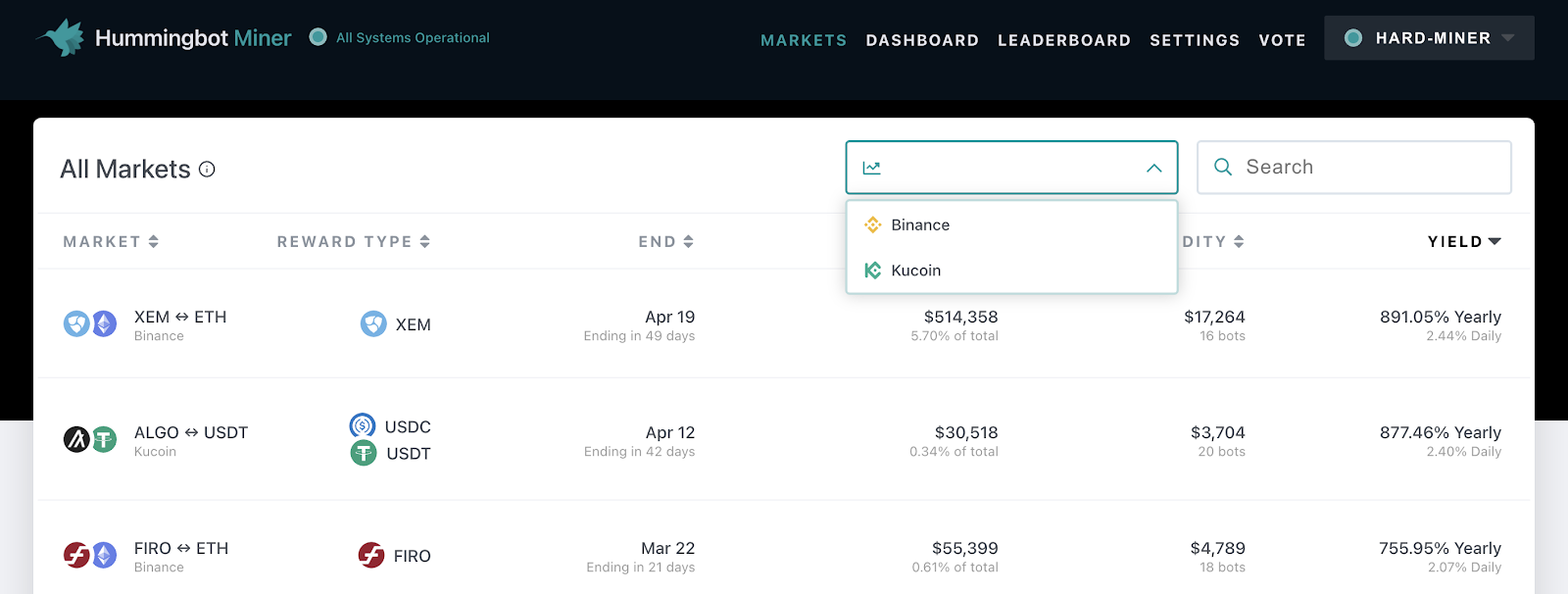 矿工获得的奖励包括 USDC、USDT、XEM、RLC、FIRO、USDT-TRON、ALGO、USDT ASA 和 USDC ASA(Algorand 标准资产)、STRAX 以及 AVAX。我们正在持续扩展 Hummingbot Miner 的功能,以便能够在发行方自己的区块链上使用其原生代币发放奖励。