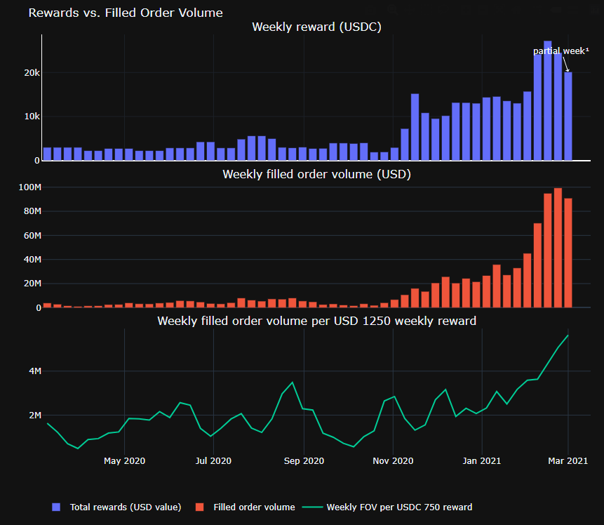 在过去一周中,相当于 1,250 美元 的周奖励池(我们建议发行方开展活动的最低金额),带来了每周平均 570 万美元的已成交订单量