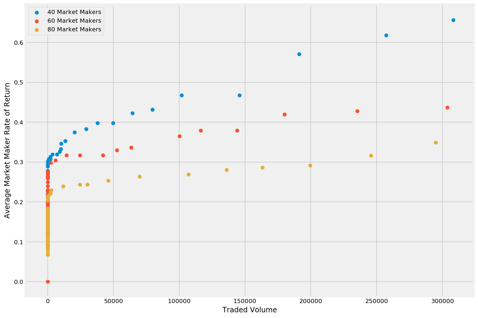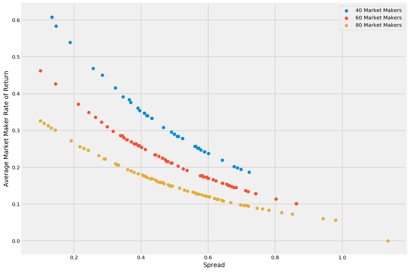 我们假设每月总预算低于 5000 美元,这只是当前交易所和代币发行方支付给做市商金额的一小部分。随后我们进行了包含 40、60 和 80 家做市商的模拟,分别代表低、正常和高流动性时期。输入的市价单被建模为具有随机到达速率和大小的泊松过程。更多详情请参见《§3.5.2 基于模拟的分析:结果》,流动性挖矿白皮书。
