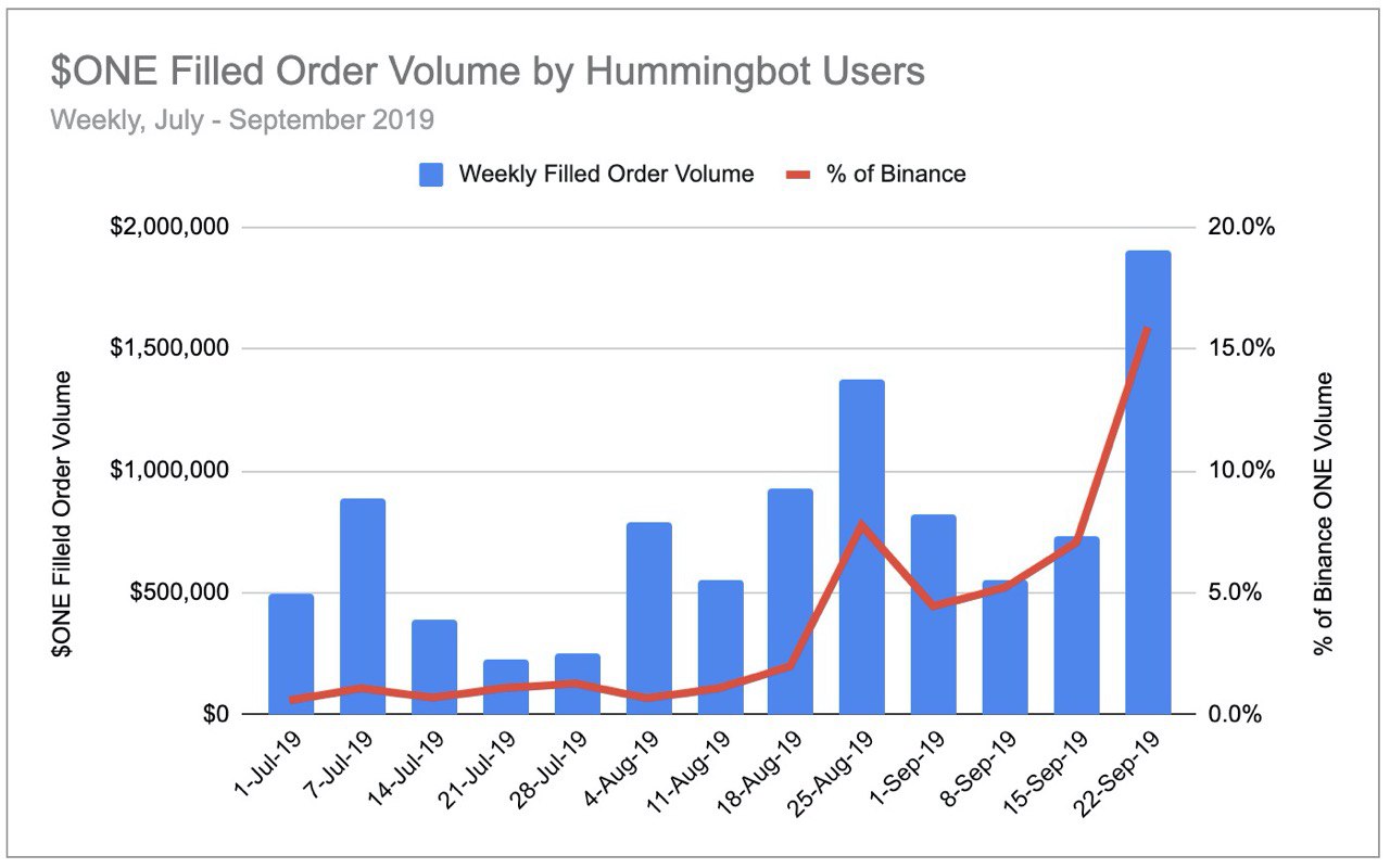 今年 7 月,我们与 Harmony 协议合作开展了一项为期三个月的试点项目,旨在评估其社区成员是否能够提供与专业做市商相当的流动性水平。在为期三个月的过程中,约 70 名个人贡献了 Harmony $ONE 代币在币安交易所总交易量最高达 15%的部分: