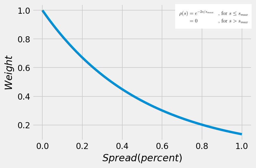 我们采用指数衰减函数,对每一档连续价差水平赋予相应的权重。流动性买方可通过调整两个简单参数——函数常数和最大价差——来自定义该分布。