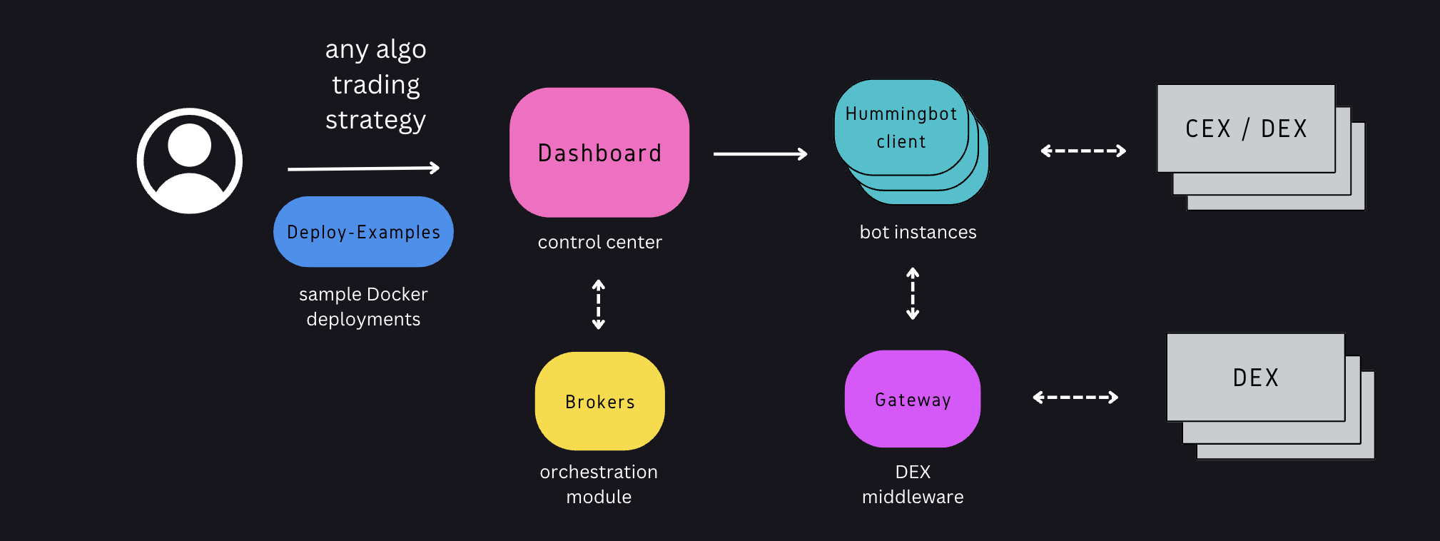 这五个仓库协同工作,让用户能够以任何他们喜欢的方式部署和使用 Hummingbot。例如,个人用户可能仅运行一个做市机器人实例,并搭配标准控制面板分析其性能;而交易公司则可利用同一套技术栈部署多个机器人,每个机器人运行独立的自定义策略,并通过自定义控制面板分析其整体表现。
