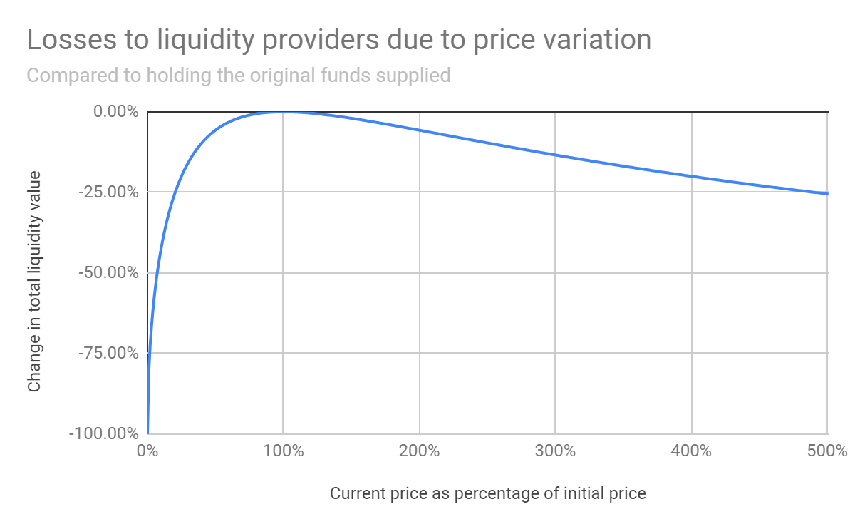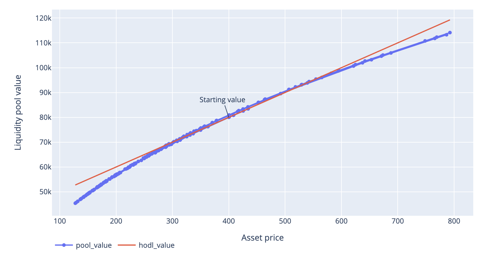 一旦发生交易导致价格上下波动(沿横轴移动),锁定代币的总价值就会随之下降,无论价格朝哪个方向变动,都会沿着曲线路径变化。只有当价格最终回到最初存入代币时的水平,流动性提供者才能回到盈亏平衡点。