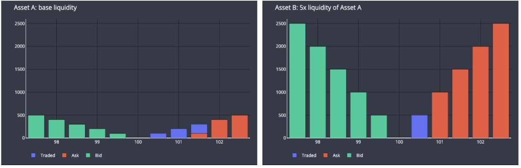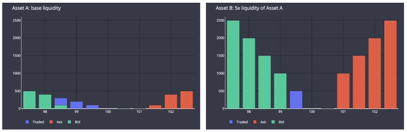 以下是两个具有相似特征的订单簿示例:相同的中间价、最优买价/卖价以及买卖价差。但它们的区别在于,资产 B 的订单簿流动性(订单簿深度)是资产 A 的 5 倍,即在每个价格档位上,资产 B 的订单数量是资产 A 的 5 倍。下图及汇总表格展示了在同一订单簿上执行一笔买入相同数量(500)的吃单买入指令所产生的影响。蓝色条形表示该订单消耗的卖单: