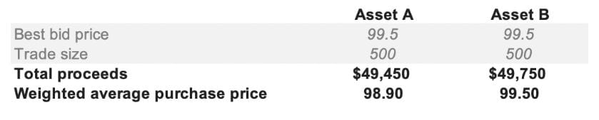 我可以卖出 500 单位的资产 A 和 B,并且在资产 B 上额外获得 300 美元。在完成买卖交易后,我在交易资产 A 时亏损了 1,100 美元(买入花费 50,550 美元,卖出收回 49,450 美元),而在交易资产 B 时仅亏损 500 美元(买入花费 50,250 美元,卖出收回 49,750 美元)。我在资产 B 上的交易摩擦成本更低。作为一项投资,资产 A 的价格上涨幅度必须超过资产 B,才能弥补因流动性较低而带来的额外摩擦成本。