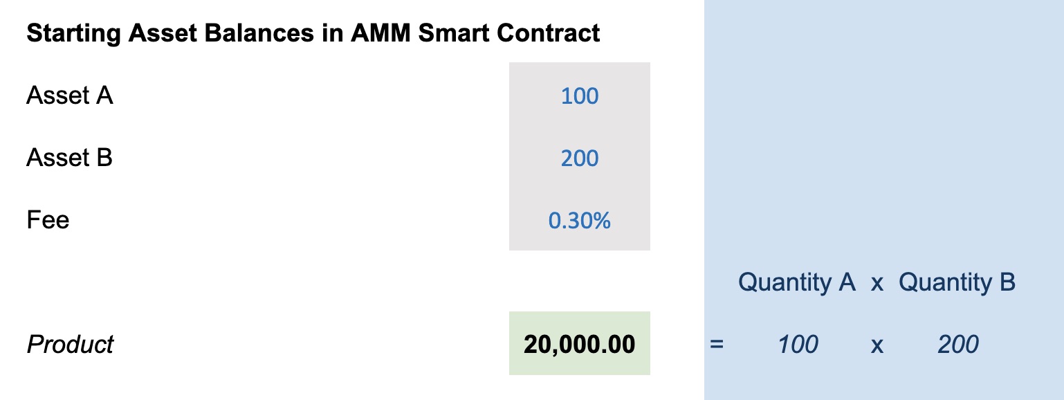 AMM 的机制实际上非常简单;以下是 Uniswap 风格合约的一个数值示例(供参考,请参见此 AMM 电子表格)。我们从一个用于交易两种资产的合约开始,即资产 A 和资产 B。一位流动性提供者(或一组流动性矿工总体而言)已存入了 100 个资产 A 的代币和 200 个资产 B 的代币。Uniswap 是一种“恒定乘积做市商”,这意味着交易中使用的汇率将确保在任何交易前后,资产 A 和资产 B 数量的乘积保持不变。在这个例子中,初始乘积为 20,000:
