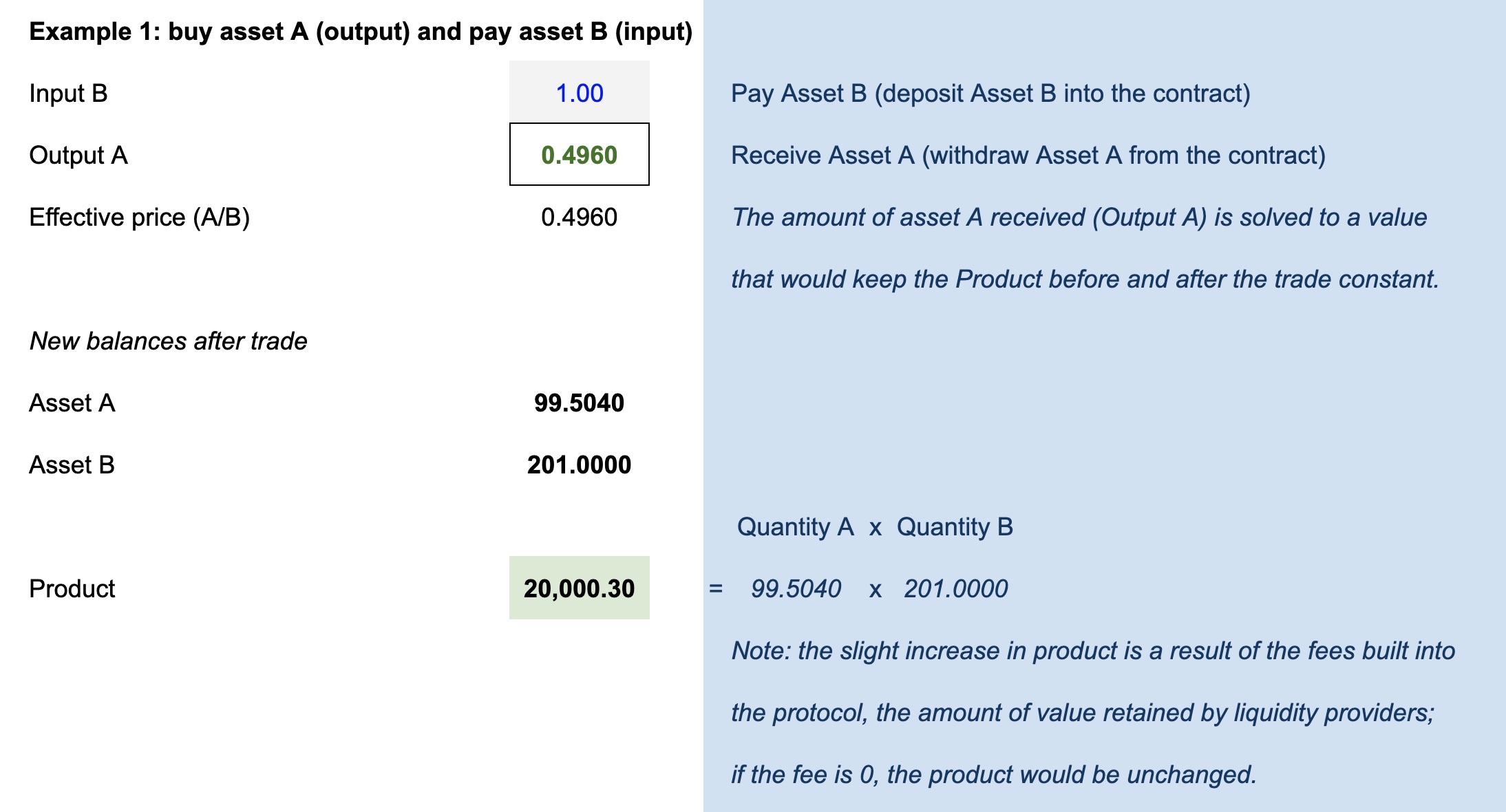 上述示例还展示了流动性提供者的好处,即内置的 0.30% 手续费。对于 100 单位资产 B 的交易,合约会保留大约 0.003 单位资产 B 的价值(100 × 0.3%)。在本次交易中,交易者获得了 0.496 的资产 A。如果没有 0.30% 的手续费,交易者本应获得 0.4975 的资产 A。剩余在流动性池中的 0.0015 资产 A 就是流动性提供者保留的价值。