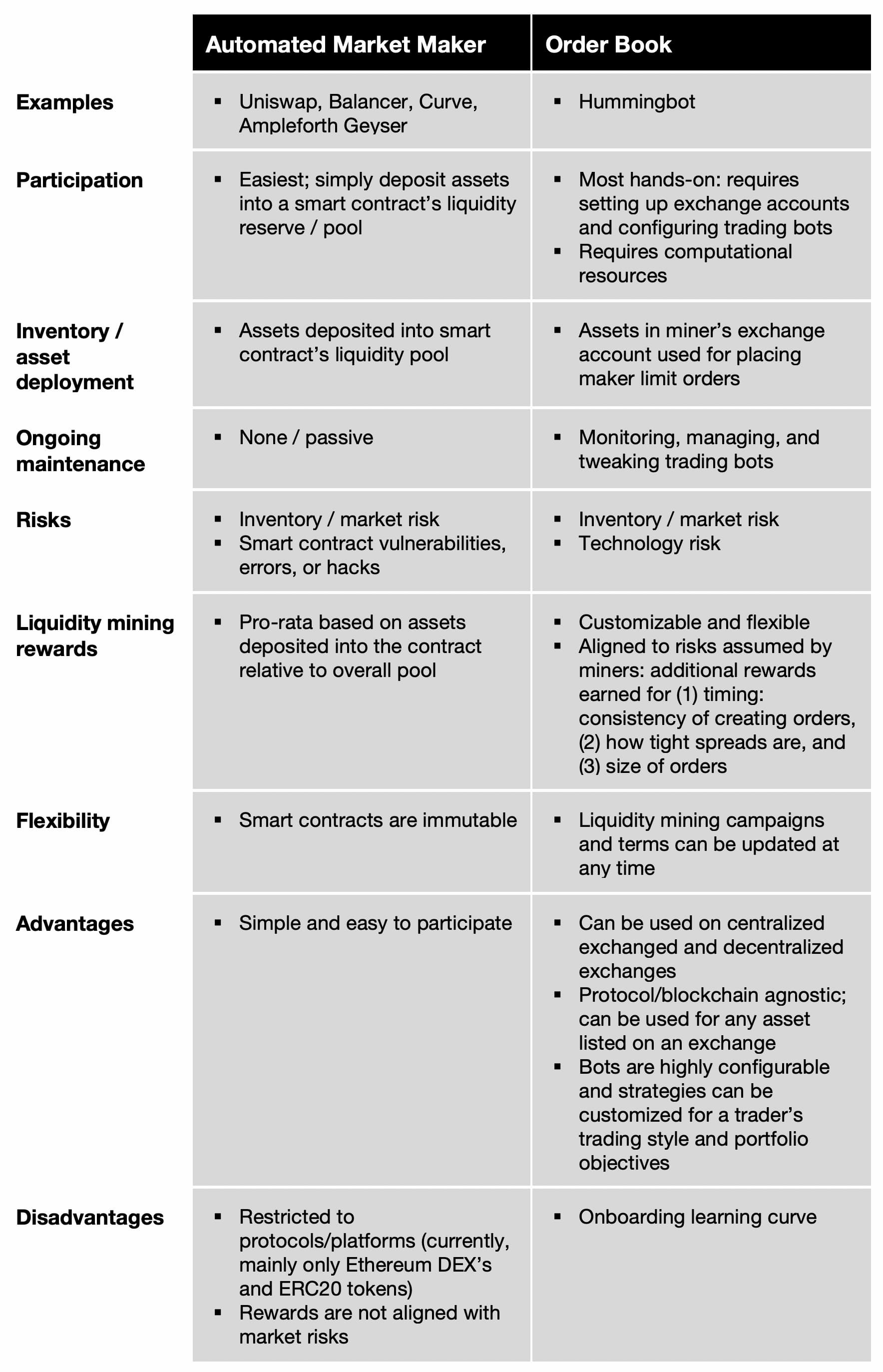 虽然 Hummingbot 的流动性挖矿专注于让去中心化的做市商在中心化限价订单簿(即中心化和去中心化交易所)上做市,但像 Uniswap、Balancer 和 Curve 这样的协议也通过让用户贡献资产供自动做市商使用,从而吸引去中心化的流动性提供者来促进流动性。
