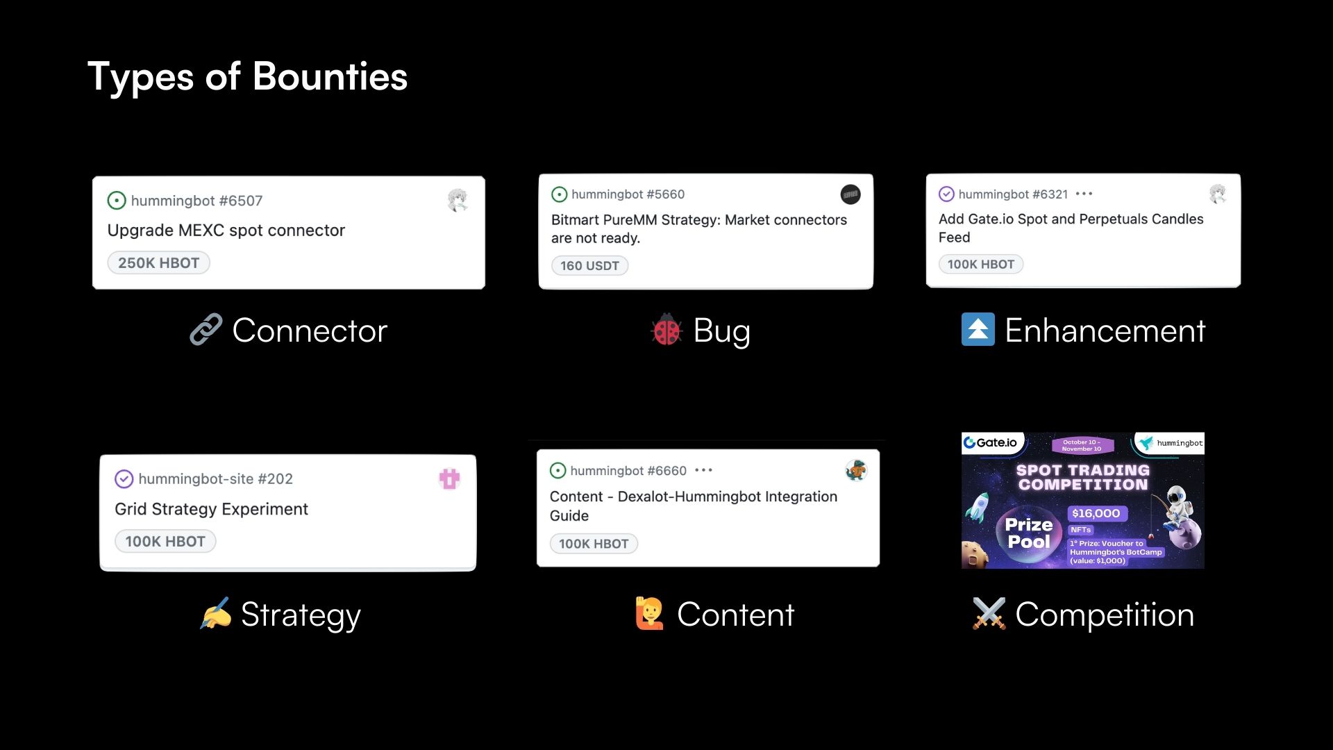 赏金被用于资助特定任务,以提升交易所或链连接器的可用性和功能。虽然 Hummingbot 基金会会主动为其合作伙伴和赞助商创建赏金任务,但任何 HBOT 持有者均可提议新的赏金任务。