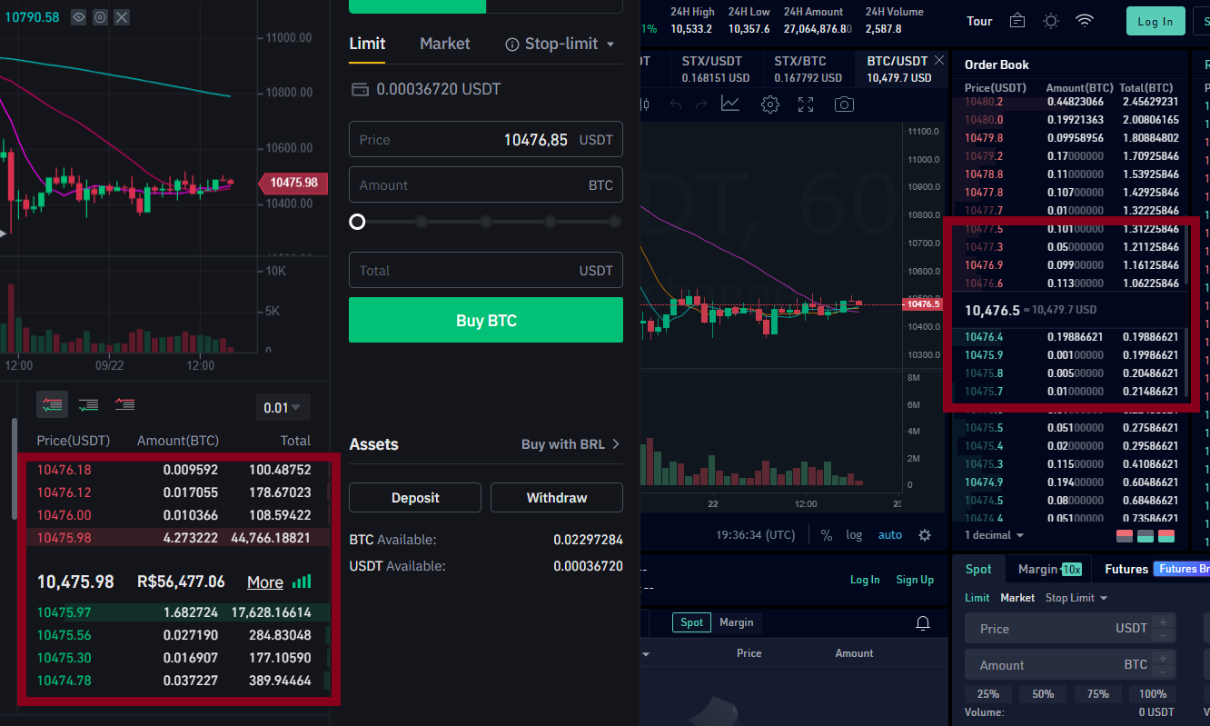 - 在另一个交易所(交易所 B)上,我作为挂单方挂出订单。由于我知道我可以在交易所 A 以$10,475.97 的价格卖出、以$10,475.98 的价格买入,因此我在交易所 B 上挂出一笔买入 BTC 的订单,价格为$10,474.97,同时挂出一笔卖出订单,价格为$10,476.98。