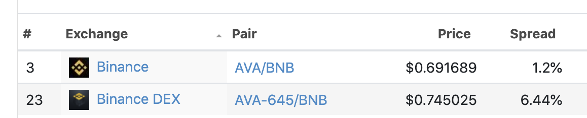 以 Travala(AVA)为例,这是 Binance DEX 上交易量最大的代币,我们将其在 Binance DEX 上的买卖价差与中心化交易所 Binance.com 上的价差进行比较,数据来自Coingecko: