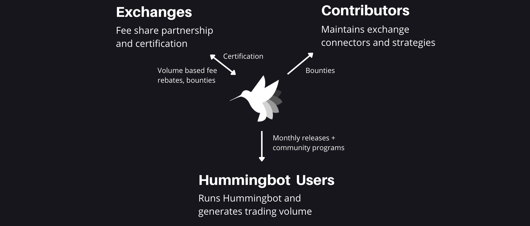 Hummingbot 基金会的主要角色是通过一组去中心化的参与者——交易所、贡献者 和 用户——来协调开源 Hummingbot 代码库的持续维护与改进。