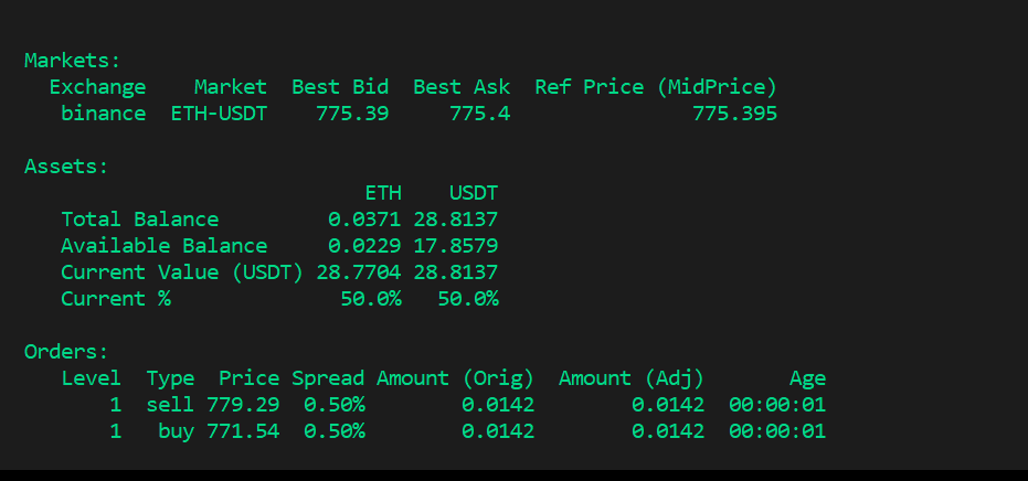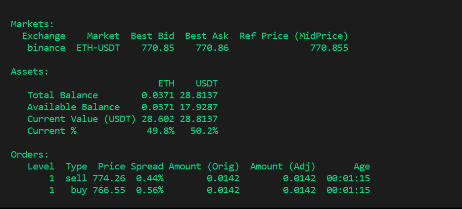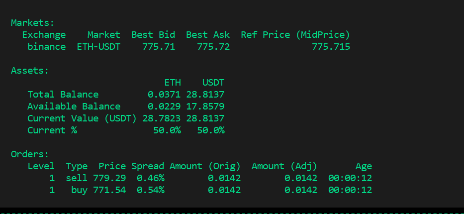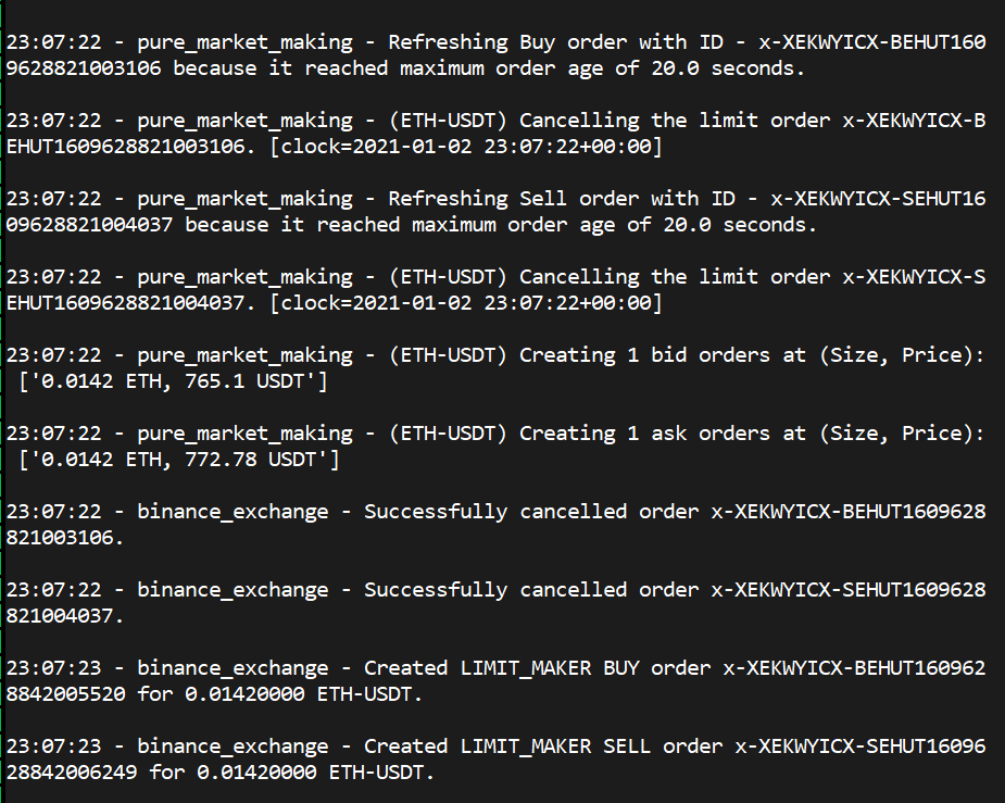 我们可以设置订单在刷新回设定价差和数量前的最大年龄。以下示例显示,由于 max_order_age 被设为 20 秒,订单年龄在 order_refresh_time 触发前就被刷新了。