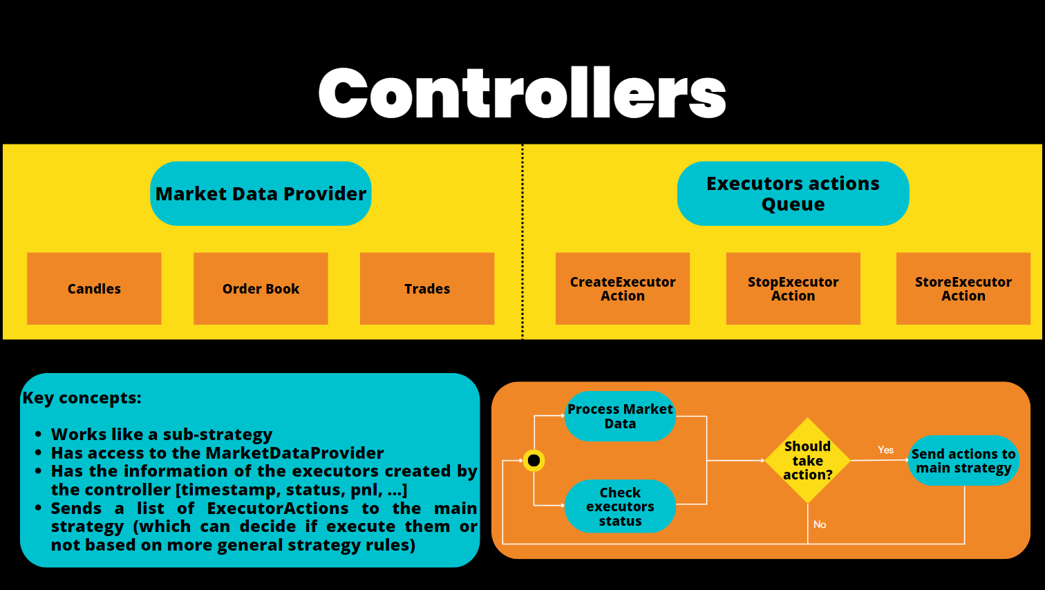 控制器在 Hummingbot 的策略 V2 框架中起着至关重要的作用,负责协调策略的整体行为。它与MarketDataProvider(包括订单簿、成交记录和 K 线数据)进行交互,并向前端主策略发送一系列ExecutorActions。主策略随后根据其整体规则和指导原则评估这些操作并决定是否执行。